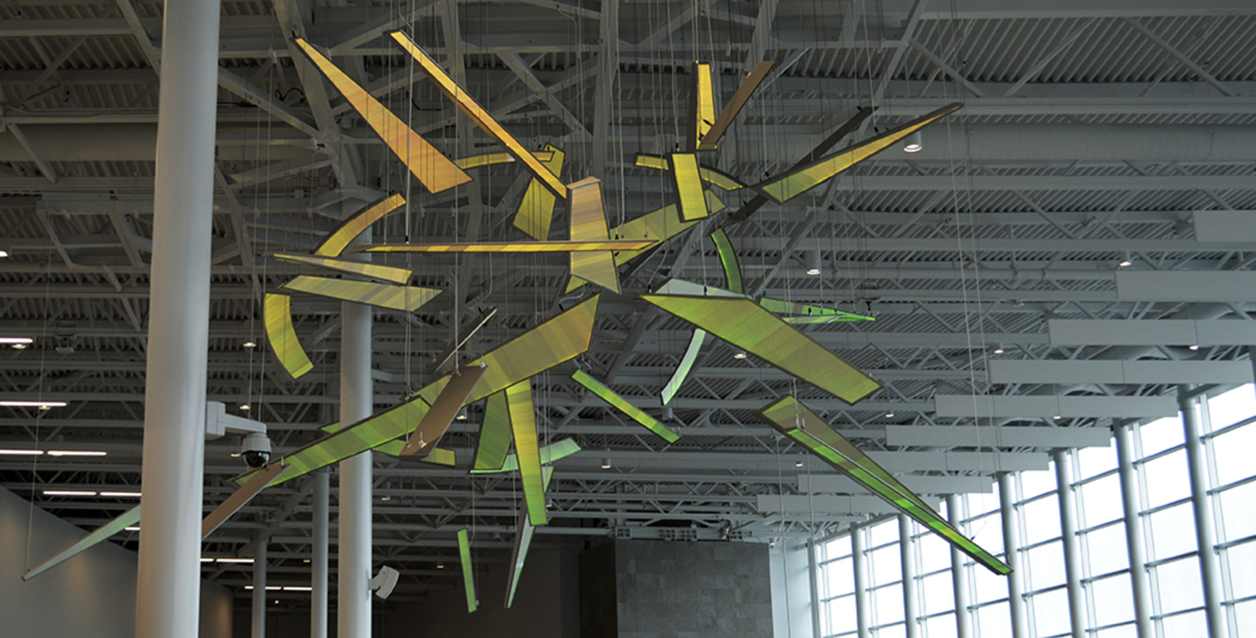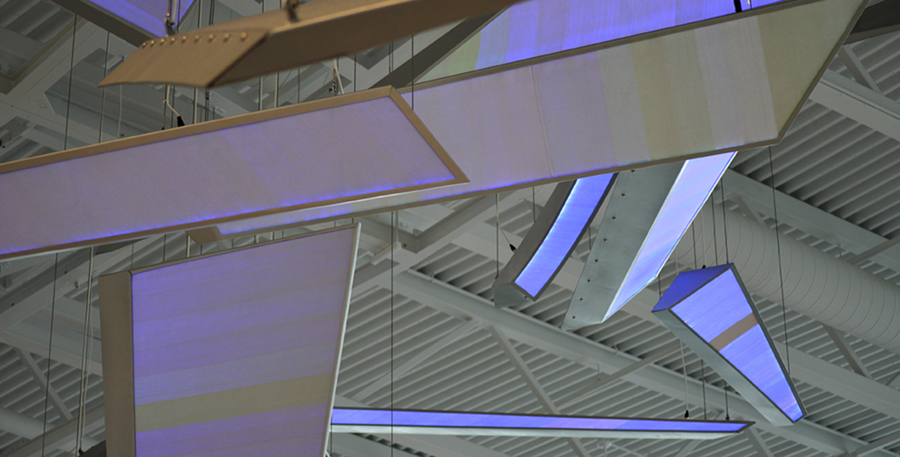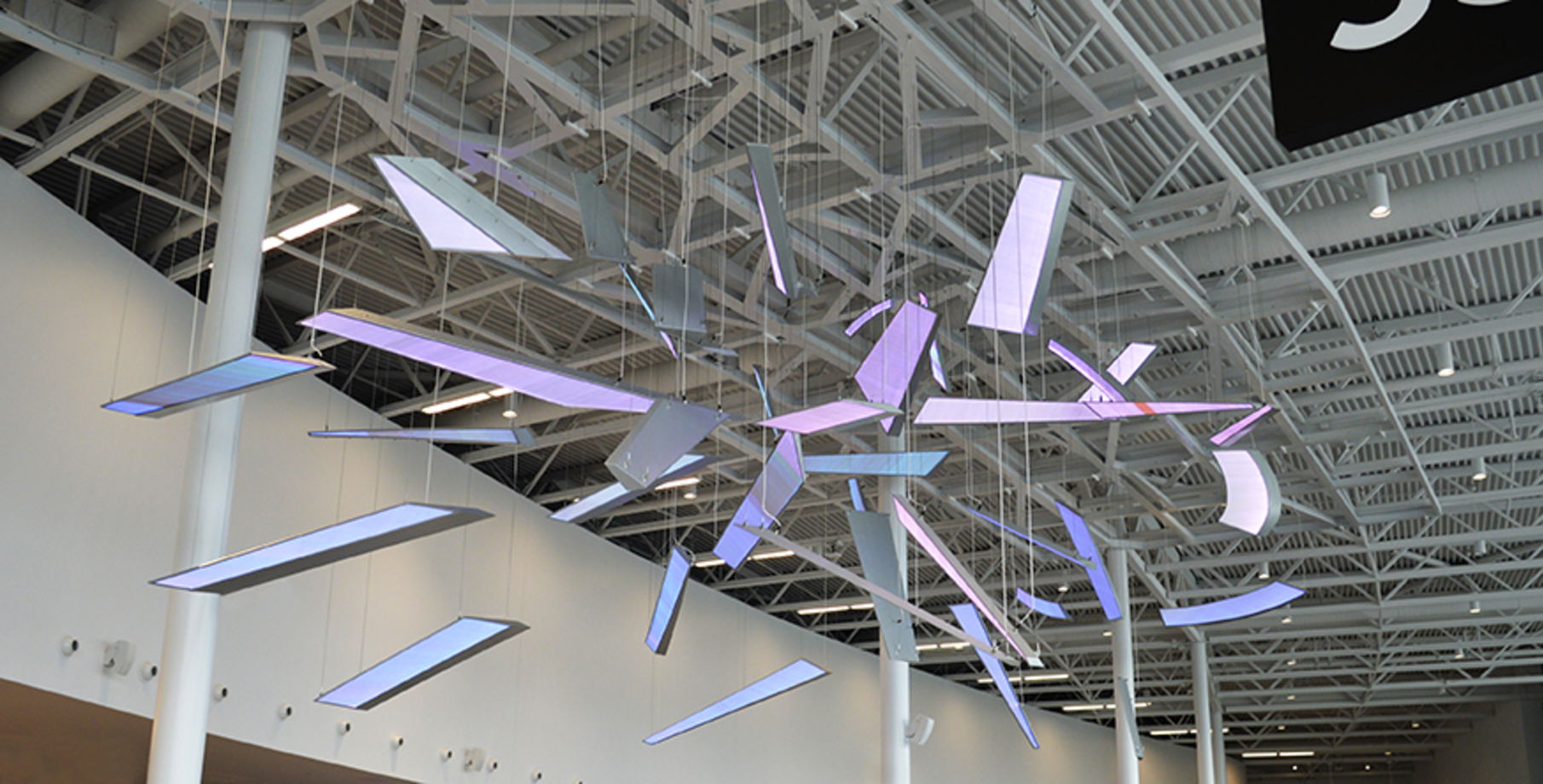 A total of 40 pieces are suspended from an aluminum support frame using cabling.